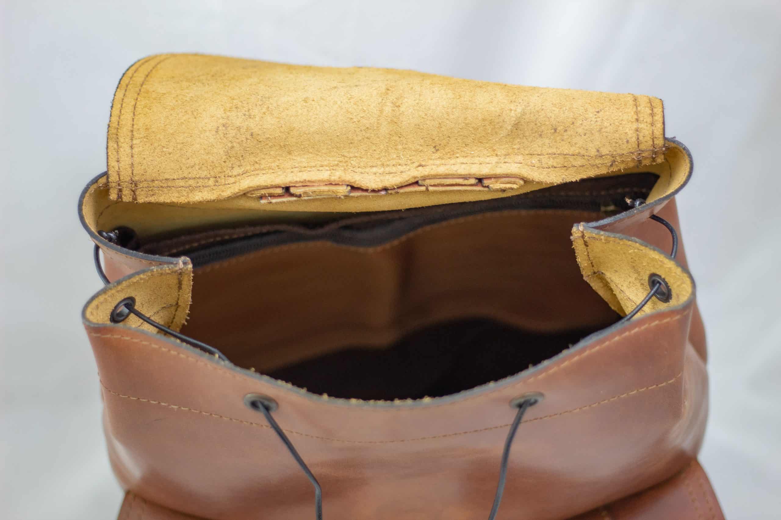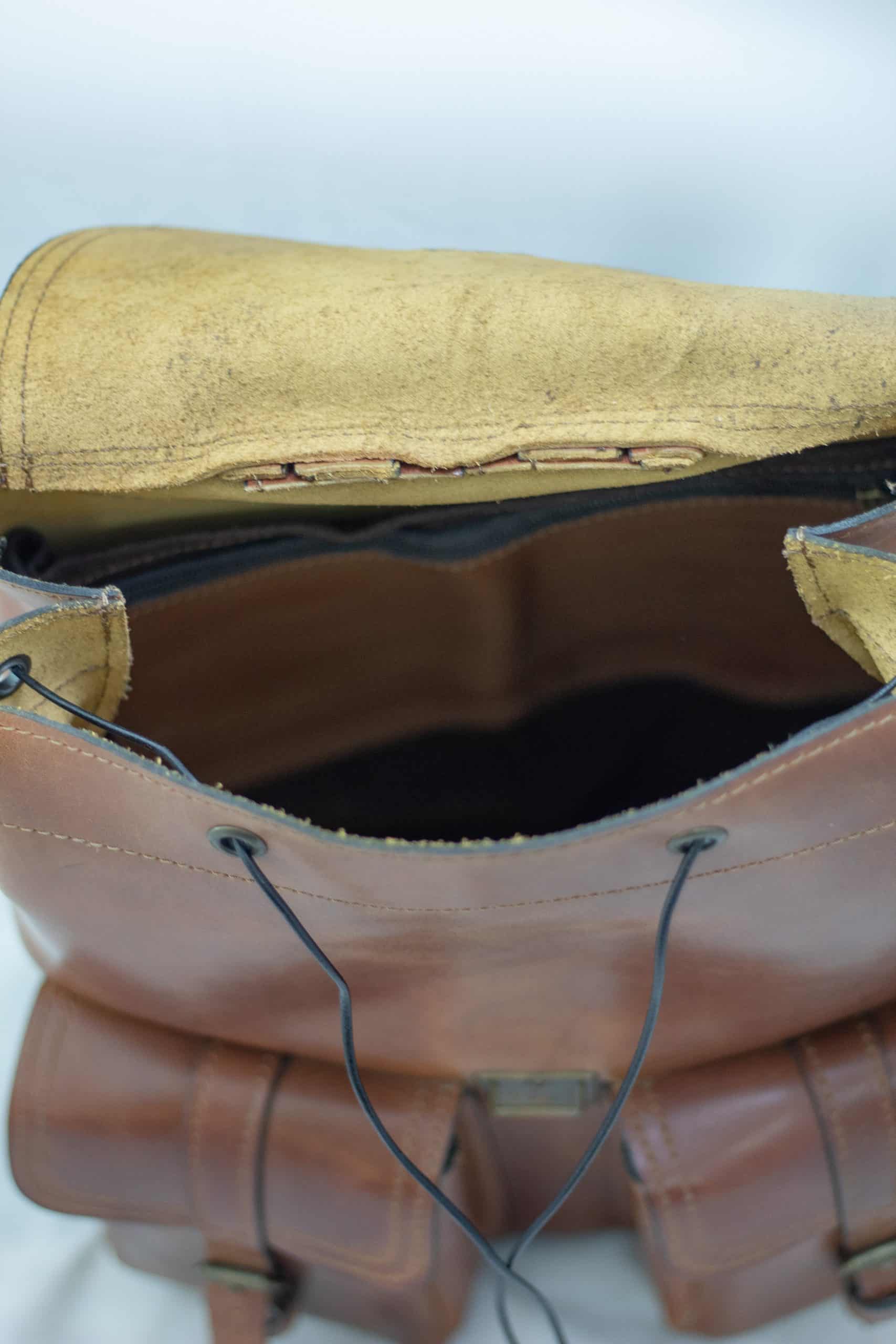 Unisex big-size rucksack handmade from 100% cow leather stitched with 20mm triplex nylon thread. Has one main pocket with an extra hidden pocket inside with a zipper, also one extra leather case designed for laptop or notebook. Also the straps are three pieces of leather for extra strength.