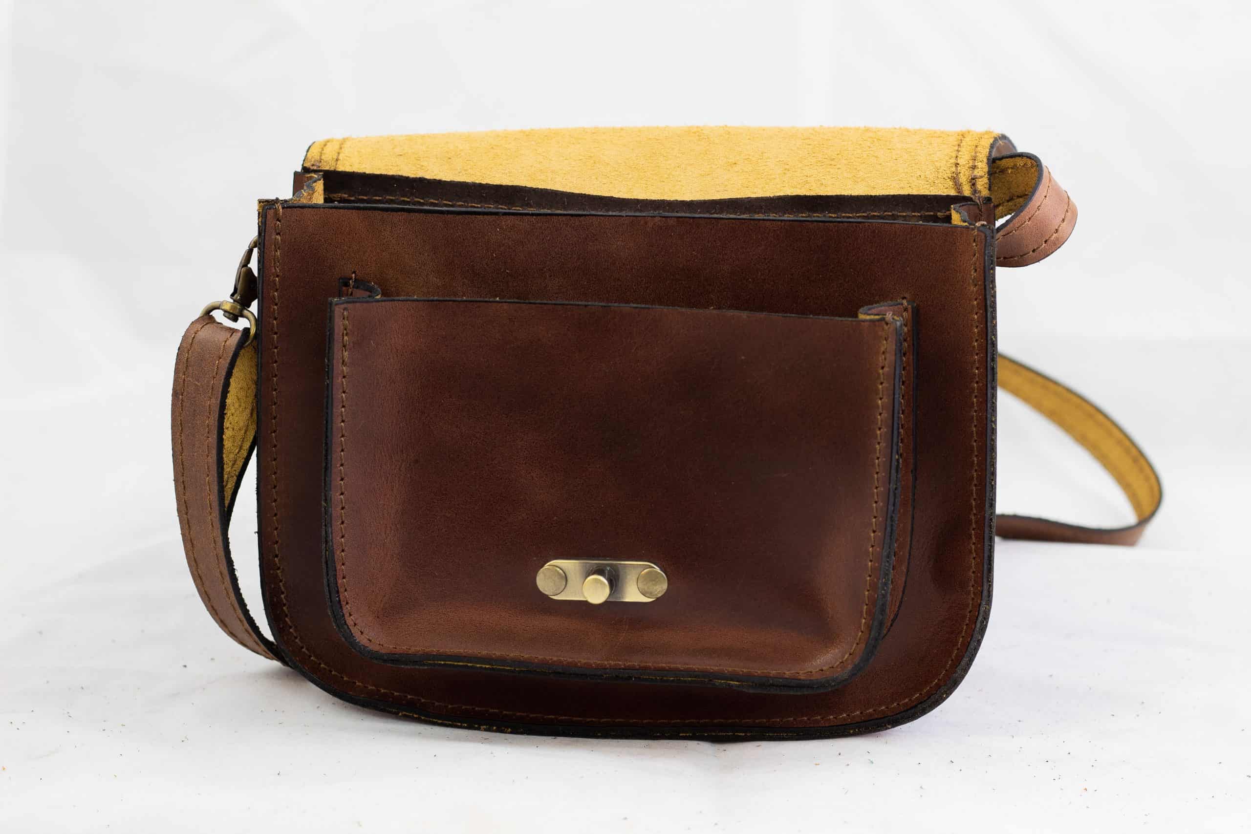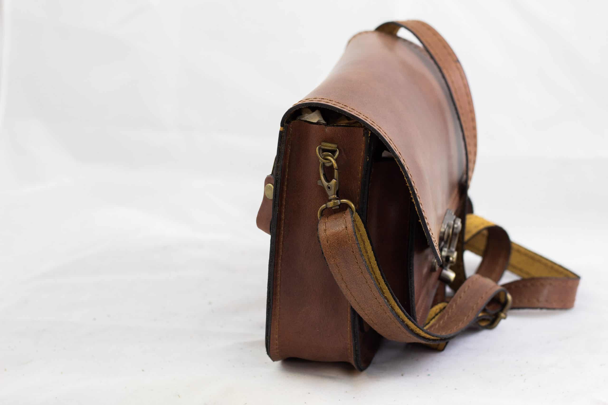 Crossbody leather bag from 100% cow leather, stitched with 20mm triplex nylon thread. Has also a small pocket with a zipper in the backside. Also adjustable leather strap