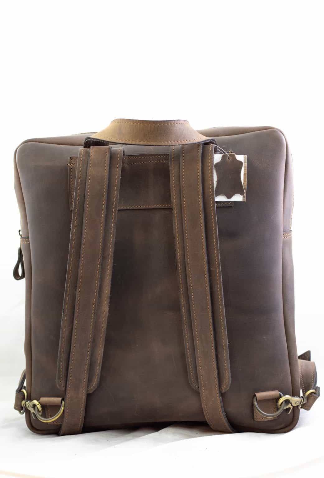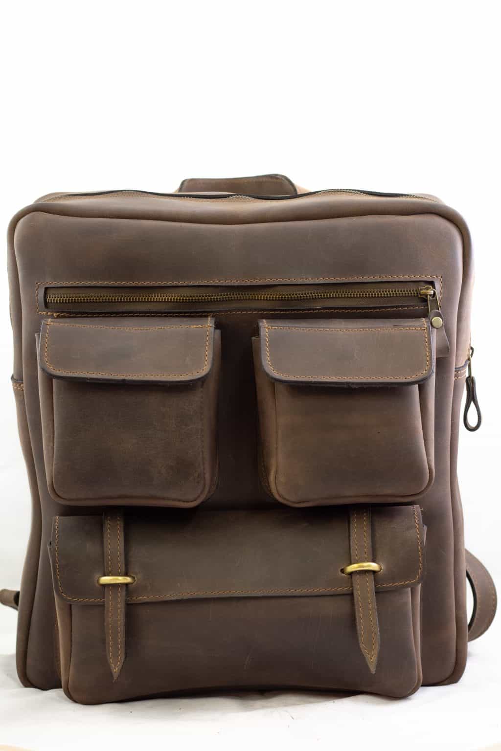 Unisex king-size rucksack handmade from 100% cow leather stitched with 20 mm triplex nylon thread. Has one main pocket with an extra hidden pocket inside with a zipper, also one extra leather case designed for laptop or notebook. Also the straps are three pieces of leather for extra strength. The front pockets opens/closes with magnetic lock for greater convenience.