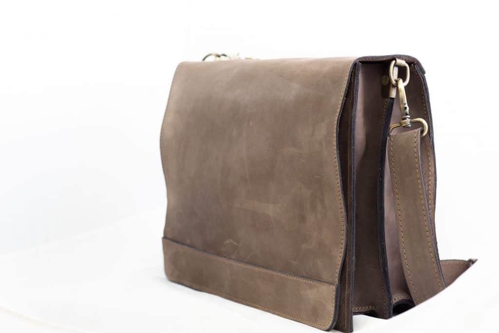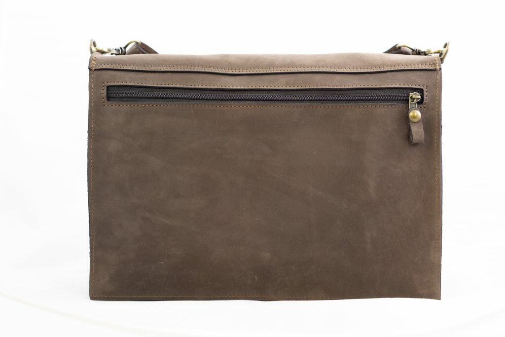Crossbody laptop bag from 100% cow leather, stitched with 20mm triplex nylon thread. Has also a pocket with a zipper in the back and front. Also adjustable two pieces leather strap. Can fit a laptop.