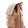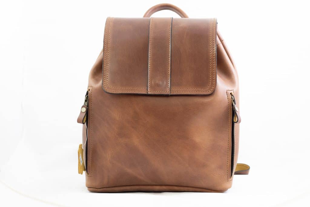 A beautiful leather backpack for women handmade from 100% cow leather stitched with 20mm triplex nylon thread. Has one main pocket with an extra hidden pocket inside with a zipper. Also the straps are one piece of leather for extra strength. The front pocket opens/closes with magnetic lock for greater convenience. Additionally has one main pocket that opens from either sides with zippers